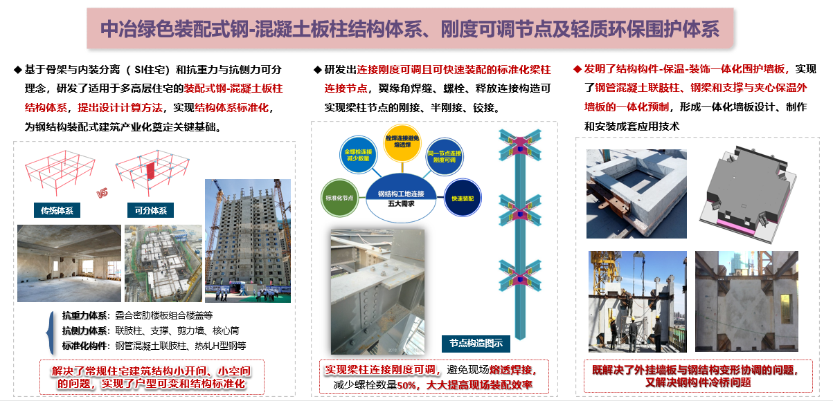 (3)中冶綠色鋼結構裝配式建筑關鍵技術:創(chuàng)新研發(fā)出適用于多高層住宅的裝配式鋼-混凝土板柱結構體系,開發(fā)了與鋼結構裝配式建筑配套的一體化輕質節(jié)能圍護墻板產品,提出了中冶綠色鋼結構裝配式建筑產業(yè)化成套技術、裝備、工藝和標準體系,實現了規(guī)模化應用。